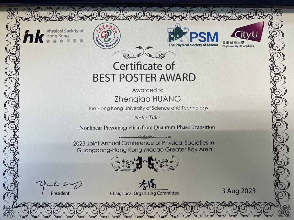 Congratulations to Zhenqiao HUANG from our group who won the “BEST POSTER AWARD” in ‘2023 Joint Annual Conference of Physical Societies in Guangdong-Hong Kong-Macao Greater Bay Area’. His poster...
