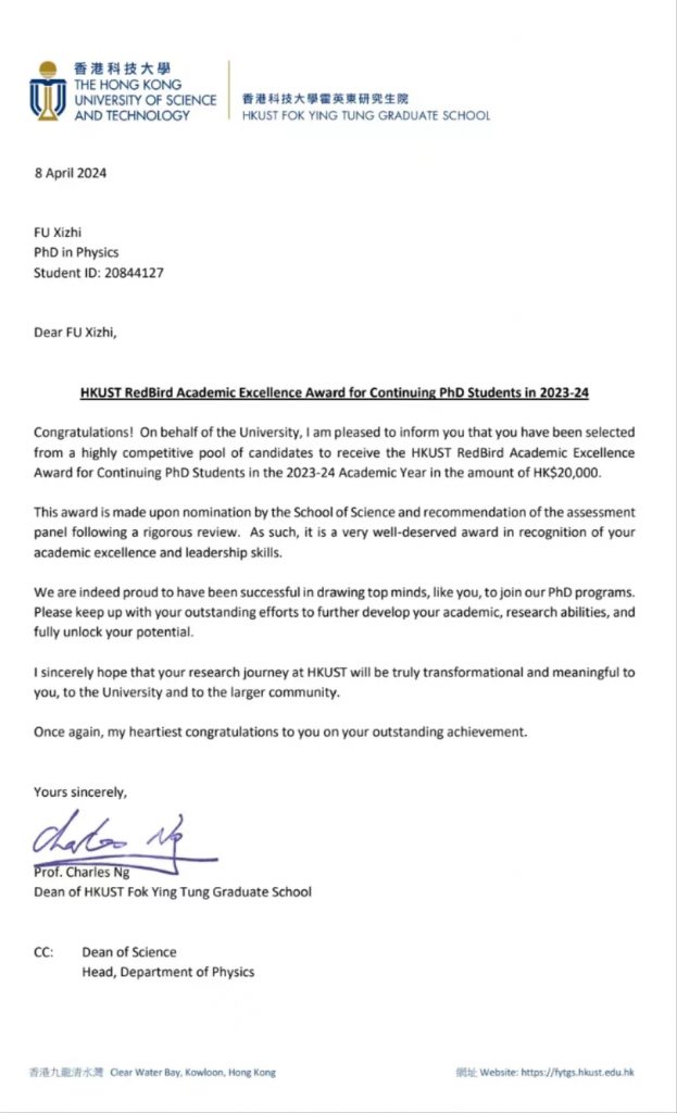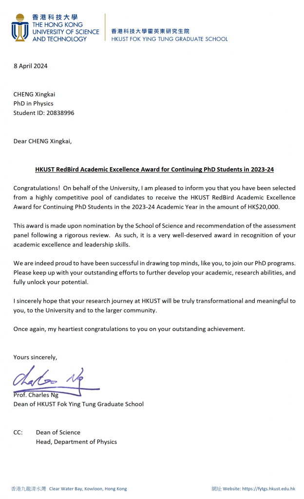 Redbird is an award for excellent PhD candidates, in recognition of their outstanding academic performance and research capacity. As a successful awardee, Mr CHENG and Fu will receive HK$20,000 of Redbird Academic Excellence Award. Before them, it has been several members from our group won this award (including new PhD and continuing PhD students). (https://pg.ust.hk/prospective-students/scholarship-fees/generous-scholarships).